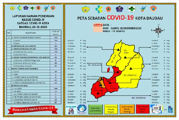 Tiga Kecamatan Wolio, Betoambari, dan Kokalukuna di Kota Baubau dilaporkan masih berstatus zona. Ini berdasarkan data yang dirilis oleh Satuan Tugas Percepatan Penanganan Corona Virus Disease 2019 dan Pemulihan Ekonomi Kota Baubau (Satgas Covid 19 Baubau), per Sabtu (26/12/20) Pukul 15.00 Wita.