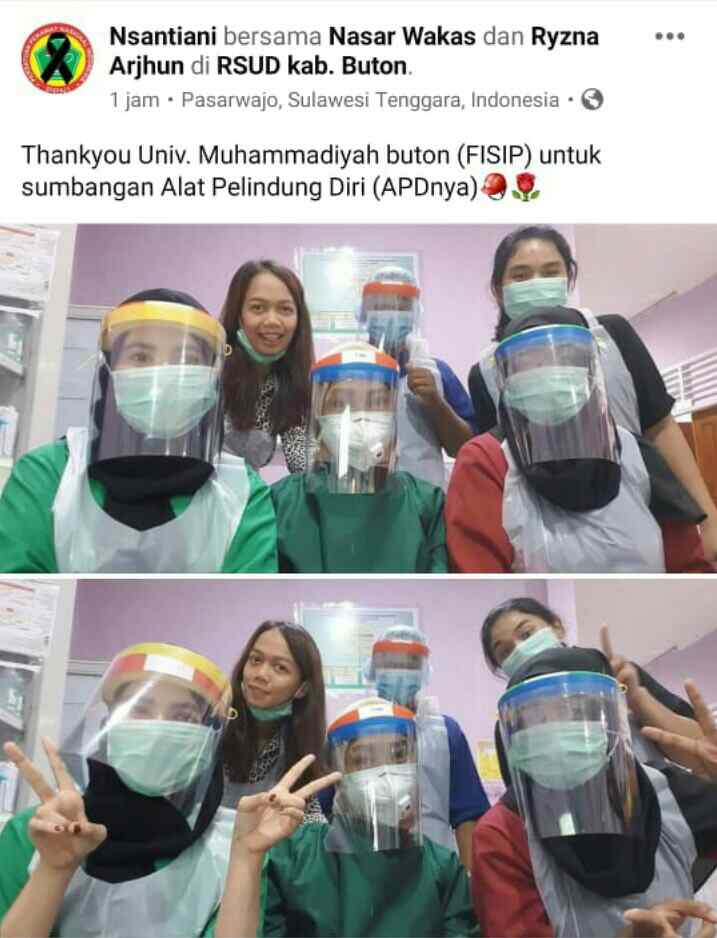 “Tahankyou Univ. Muhammadiyah Buton (Fisip) untuk sumbangan Alat Pelindung Diri (APDnya),” tulis akun Nsantiani di RSUD Buton.