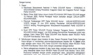 Akhirnya diskusi saling silang berpendapat, berbagai prediksi serta spekulasi politik tentang H Zahari akan mendapatkan restu untuk memimpin kembali DPD Partai Golkar Kota Baubau kini terjawab sudah. Rekomendasi / Persetujuan diterbitkan DPP Partai Golkar yang ditandatangani langsung oleh Ketua Umum – Sekretaris, Airlangga Hartarto – Lodewijk F Paulus, dalam lembar Surat perihal Rekomendasi sebagai calon Ketua DPD Partai Golkar Kota Baubau, nomor B. 346/GOLKAR/VIII/2020, Jakarta 11 Agustus 2020.