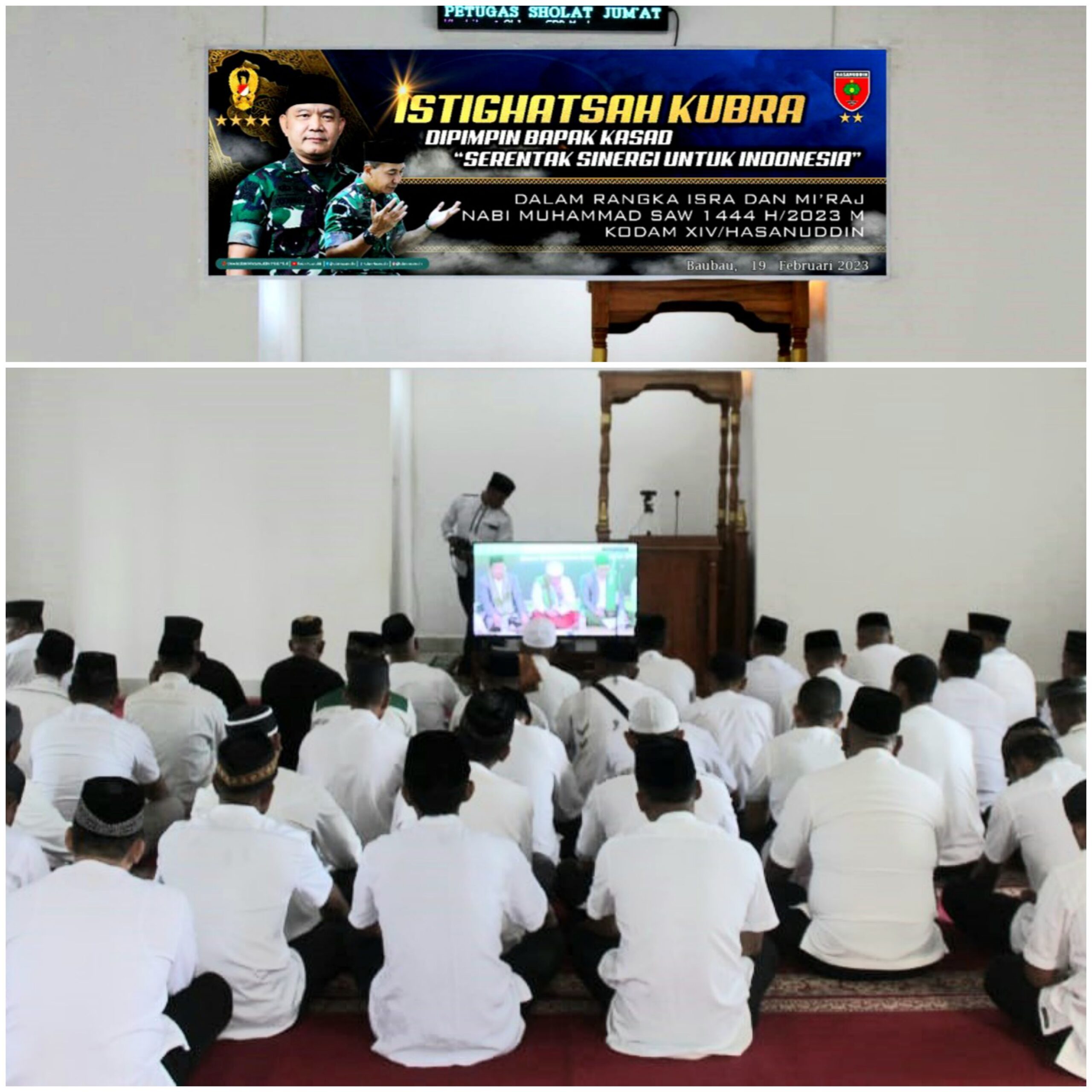 Minggu 19 Februari 2023 Pukul 08.00 Wita sampai selesai, di Masjid Nurul Khurriyah Kodim 1413/Buton, telah berlangsung Istighotsah Kubra memperingati Isra Mi’raj Nabi Muhammad SAW 1444 H/2023 M. Giat ini dilaksanakan Kodim 1413/Buton secara virtual, diikuti 250 orang dari TNI, Polri, Ibu Persit dan masyarakat.