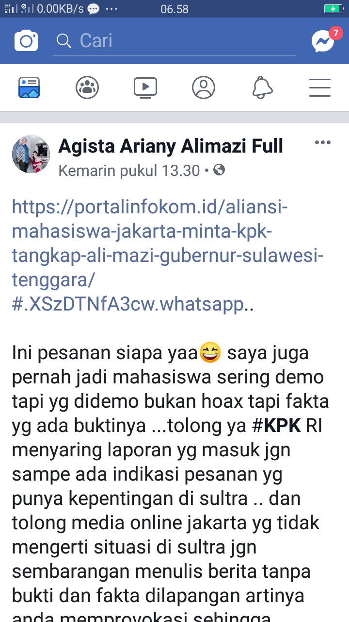 Cuitan Agista dalam akun Faceebooknya disertai link berita salah satu media cyber PORTAL INFOKOM (portalinfokom.id), yang memuat berita berjudul “Aliansi Mahasiswa Jakarta Minta KPK Tangkap Ali Mazi Gubernur Sulawesi Tenggara”.