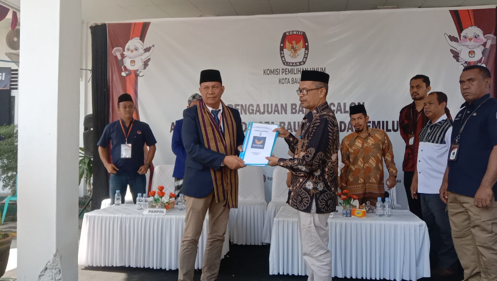 Ketua DPD Partai Nasdem Kota Baubau Arifudin menyerahkan berkas kepada Ketua KPU Kota Baubau Edy Sabara.