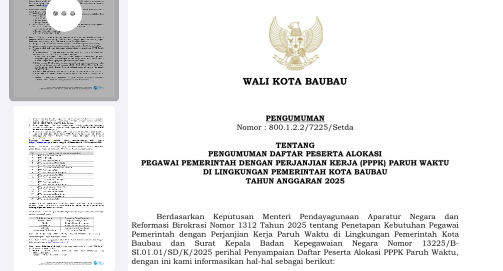 Dihari yang sama, Sekretariat Daerah Kota Baubau telah menerbitkan Pengumuman yang ditandatangani Walikota Baubau, H Yusran Fahim, Pengumuman Nomor : 800.1.2.2/7225/Setda, tentang PENGUMUMAN DAFTAR PESERTA ALOKASI PEGAWAI PEMERINTAH DENGAN PERJANJIAN KERJA (PPPK) PARUH WAKTU DI LINGKUNGAN PEMERINTAH KOTA BAUBAU TAHUN ANGGARAN 2025. Berdasarkan Keputusan Menteri Pendayagunaan Aparatur Negara dan Reformasi Birokrasi Nomor 1312 Tahun 2025 tentang Penetapan Kebutuhan Pegawai Pemerintah dengan Perjanjian Kerja Paruh Waktu di Lingkungan Pemerintah Kota Baubau dan Surat Kepala Badan Kepegawaian Negara Nomor 13225/B-SI.01.01/SD/K/2025 perihal Penyampaian Daftar Peserta Alokasi PPPK Paruh Waktu.