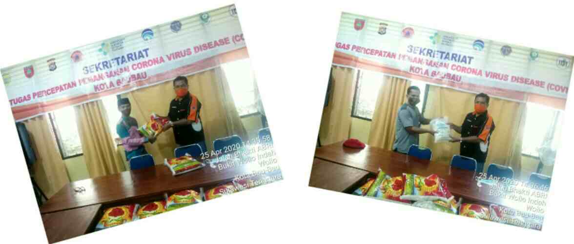 “Rencananya bantuan ini akan kami bagikan besok sore ke Kelurahan Kadolokatapi dan Kelurahan Kadolo. Bapak Lurah dan Ibu Lurah mohon pendampingannya besok sore,” kata Kepala Badan Penanggulangan Bencana Daerah (BPBD) Kota Baubau, La Ode Muslimin, usai menerima donasi, mewakili Gugas Covid-19 Baubau, Sabtu (25/4/20) sore.